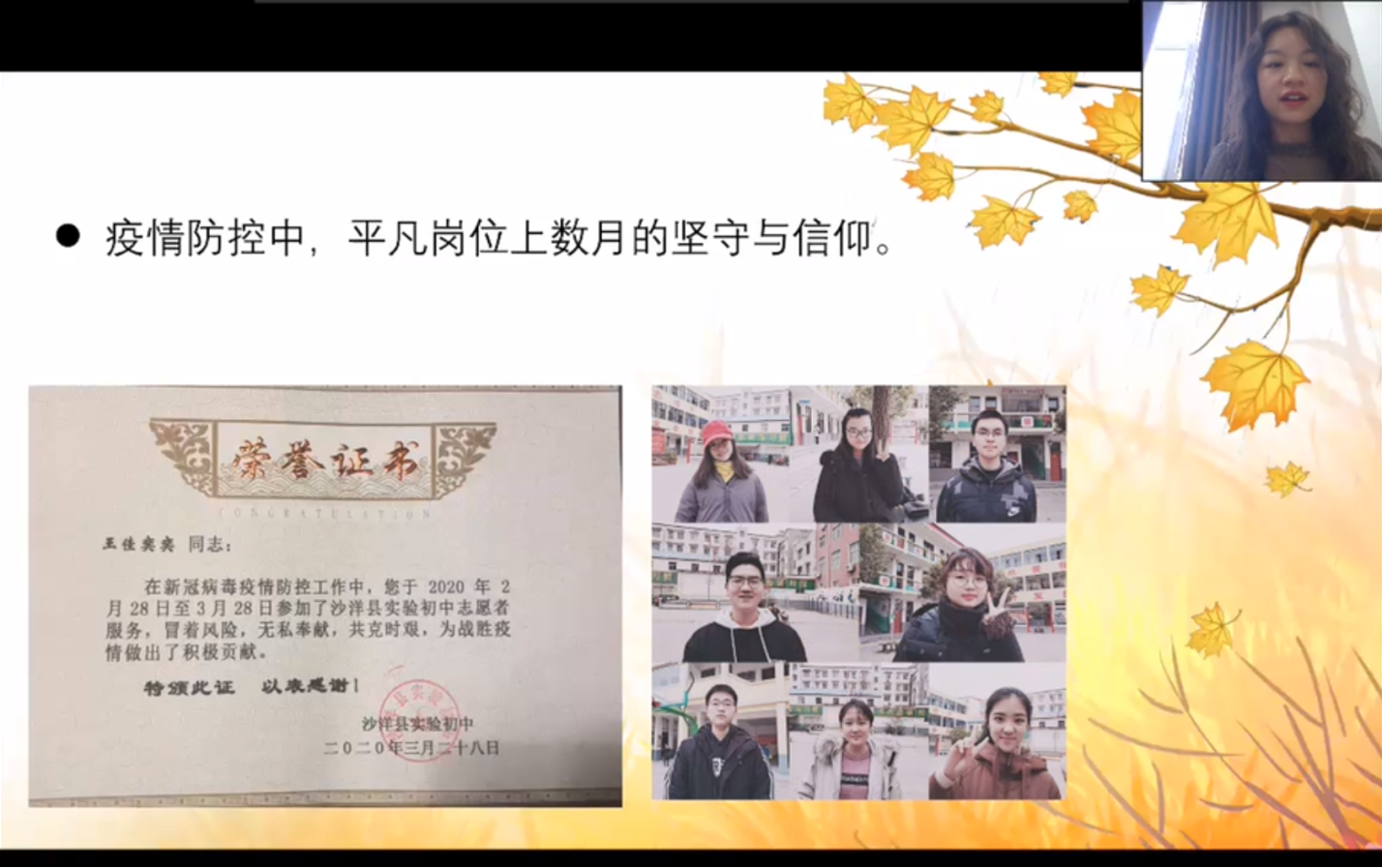 最后,来自经贸院荣誉1801的王佳奕奕同学分享她的志愿经历。她的主题是“志愿有我,为爱发声”,她以一个故事线的形式,分享她的成长与经历。来自湖北的她,曾经处在疫情最严重的地区之一。但是她非常勇敢地迈出第一步,作为志愿者为周围人保驾护航,告诉大家以科学态度积极面对疫情。她分享了自己的支教故事,鼓励同学们关爱留守儿童,让文化走入大山。最后她以“最靓丽的个人风采不是一张证书奖状,而是扎根基层、用爱发电的每一个美好瞬间”做分享结尾。面对大家的提问,她建议同学们学会规划时间,分清事情主次,同时注意不要把自己活成一个封闭的个体。针对如何准备十佳志愿者的问题,她指出应时长充足最后只要真情实感地展现自己就足够了。