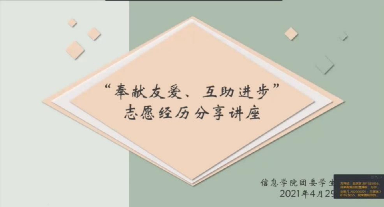 2021年4月29日15:30,博彩社区-论坛博彩 志愿经历分享讲座在线上顺利举行。讲座伊始,主持人向大家播放了一段由博彩社区-论坛博彩 志愿服务中心出品的视频作为整场讲座的引入。视频充分展现了志愿服务的意义以及博彩社区-论坛博彩 志愿服务的成果,鼓励大家将志愿服务活动融入日常生活,让乐于助人成为我们生活的主旋律。